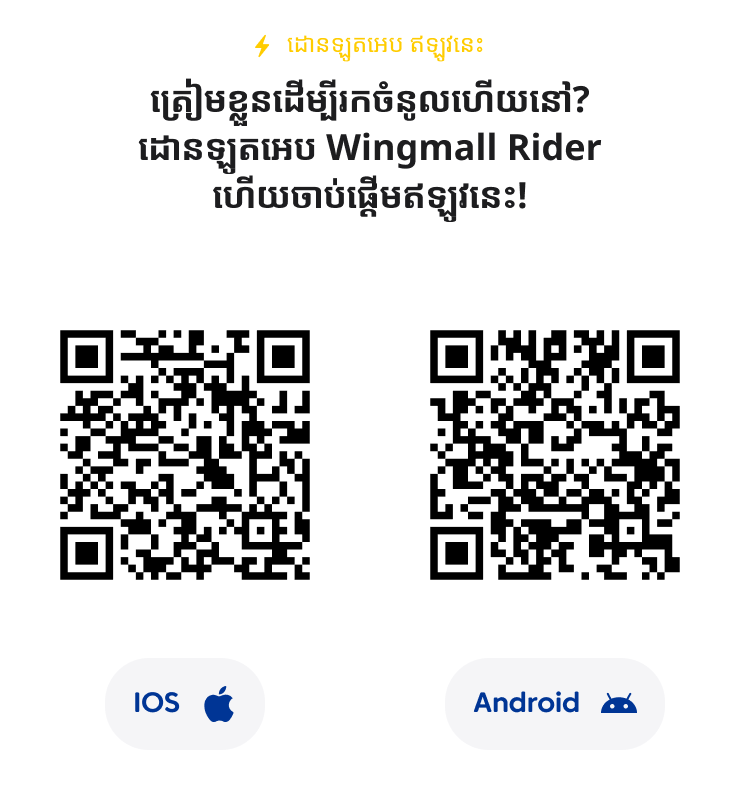 នៅពេលអ្នកនៅលើផ្លូវ យើងនៅជាមួយអ្នក - សម្រាប់ជំនួយ ដំបូន្មាន និងការគាំទ្រ ផ្ញើសារ ឬទូរសព្ទមករកជំនួយពីក្នុងអេប Wingmall។ សុវត្ថិភាពរបស់អ្នកគឺជាអាទិភាពរបស់យើង ដូច្នេះយើងនឹងធានាដល់អ្នកក្នុងករណីមានគ្រោះថ្នាក់ផងដែរ។ ការដាក់ពាក្យធ្វើជាអ្នកដឹកជញ្ជូននេះ គឺមិនមានការគិតថ្លៃអ្វីទាំងអស់។
